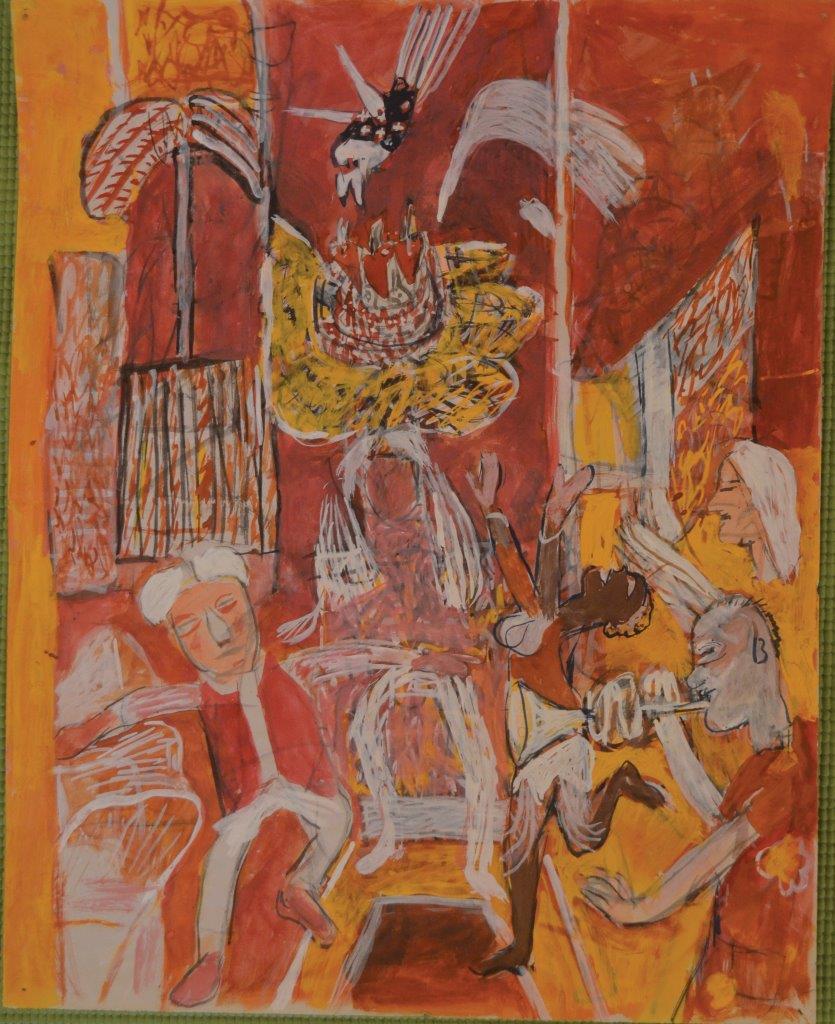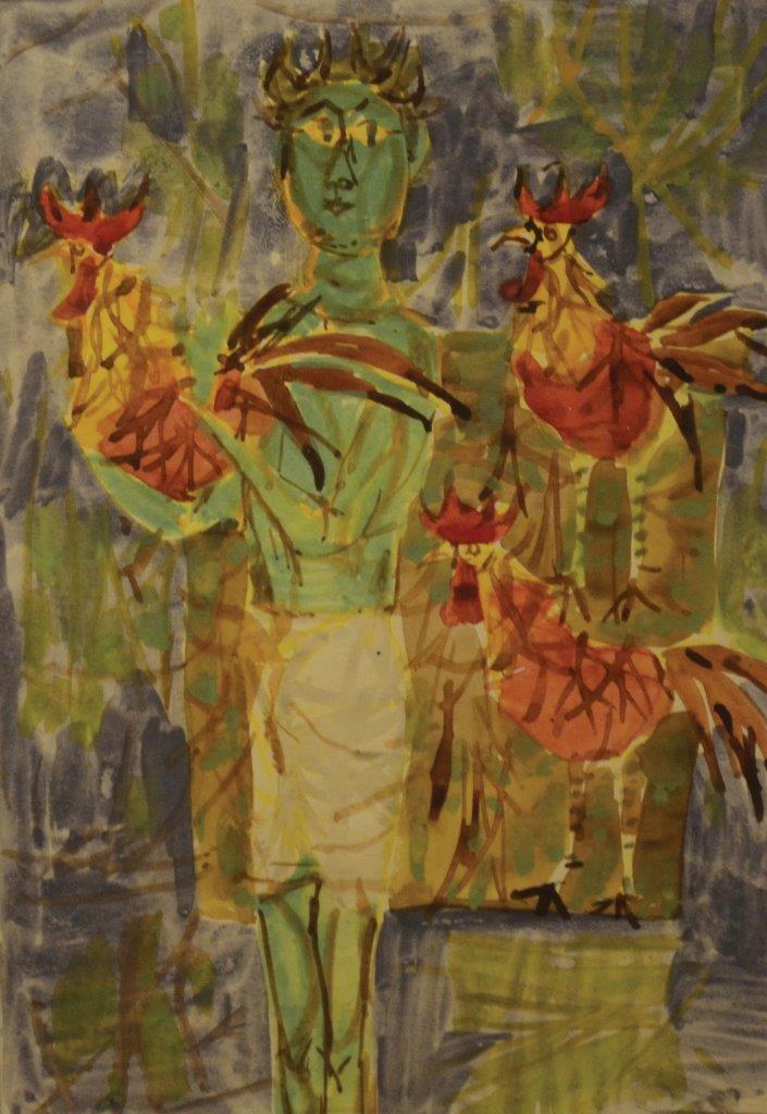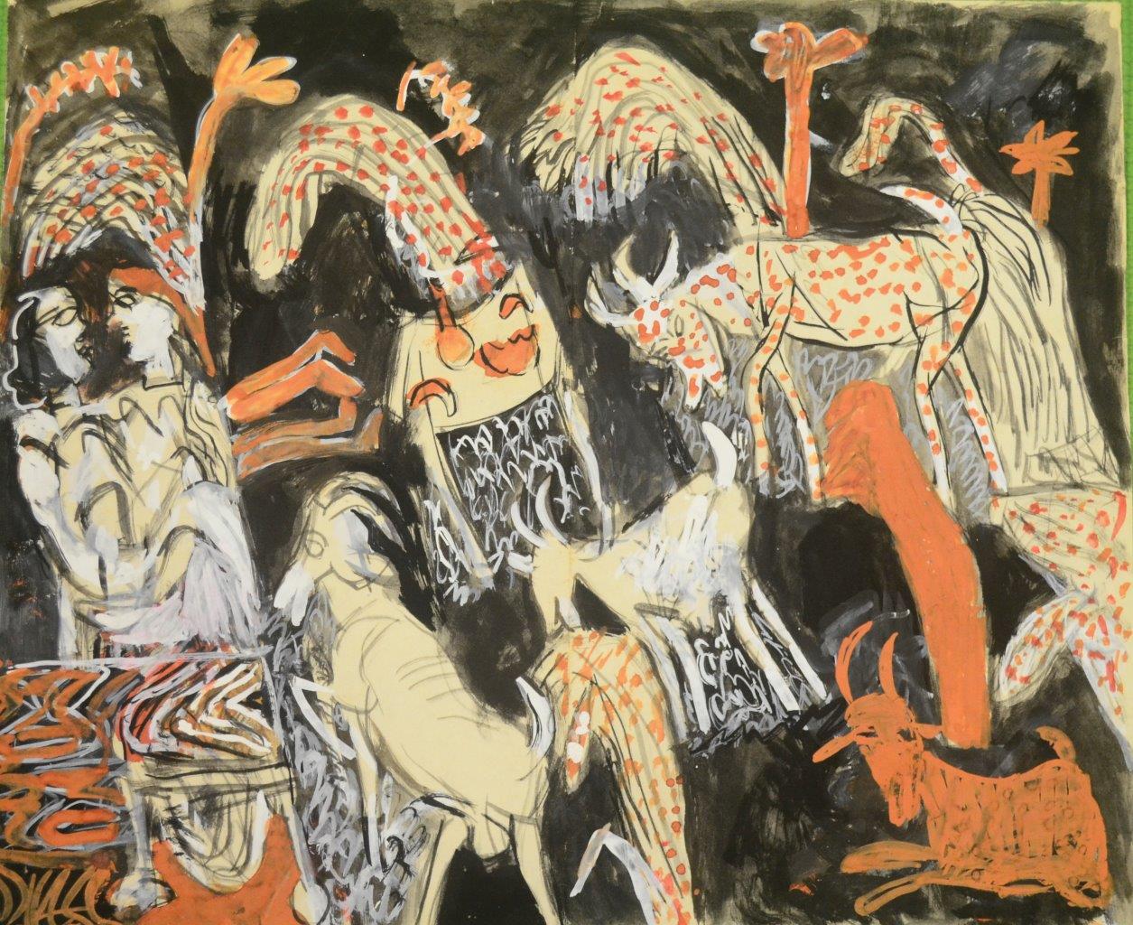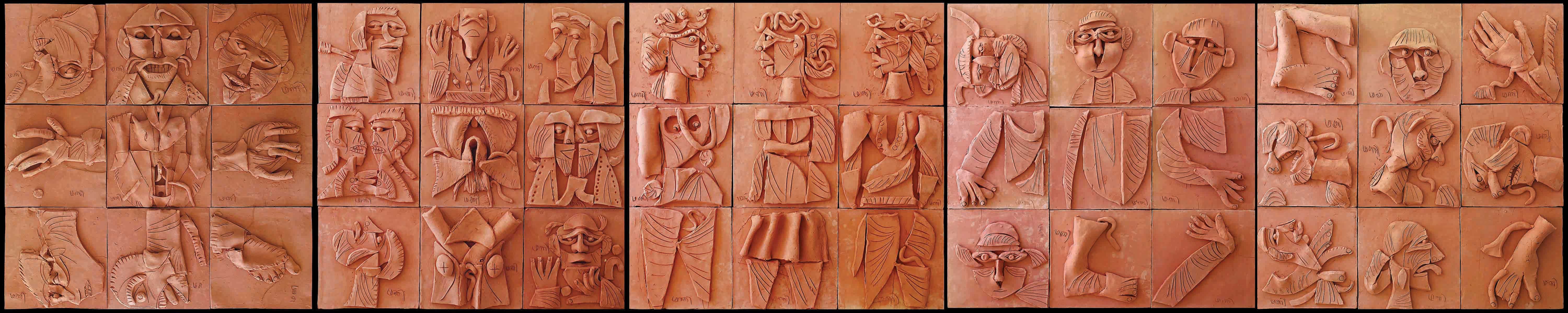 The exhibition also brings to focus his early works done in late 1940s and 1950s. According to the curator Roobina Karode, “This exhibition celebrates the versatility and fabular adventures of the legendary artist. It puts one in the company of the vivid storyteller, the pied piper, the puppeteer-magician who playfully tricked his images into performative gestures, animating them with the stroke of his brush. K.G. Subramanyan’s oeuvre represents conceptual richness and a remarkable deftness of his craft. His early works from the 1940s onwards emphasize his alert eye and receptive mind, responding to a spectrum of optical references from disparate traditions, evocatively drawing and painting schematic figures, motifs, signs and gestures, seeking equivalents of all experiences in a visual language. Our attention is drawn to the nuanced play between the graphic and painterly, precise rendering and freer brushwork, surface patterning and structural design, the decorative and expressive, working towards evolving a syncretic pictorial language. The formal and spatial articulation in Subramanyan’s work thrives on strategies of hide and seek, the opening of windows and closing of doors, prompting our gaze to peep inside and then step back to witness from a distance ‘the unfolding of multiple stories’. The exhibition brings together his first experiments in the medium of oil, for instance, in the Mother and Child painted in 1953, some works on silk and on board as well using gouache with a varnish. Viewers will enjoy the visual subtleties expressed in his reverse paintings on glass and acrylic, a medium he mastered and became an influence for artists from successive generations. The title of the exhibition ‘Anatomy Lessons’ thus addresses the artist’s play with figuration, his myriad ways of drawing and painting life as it unfolds each day, rephrasing and reconfiguring his observations and awareness about the natural, animal, and human world. In a literal sense and as a response to the precarious world he witnessed in his later years, it highlights human atrocities through dismemberment in this terracotta frieze, with fragmented limbs and severed bodies, ripped apart in the streets, visible not too far from the window of one’s home.”