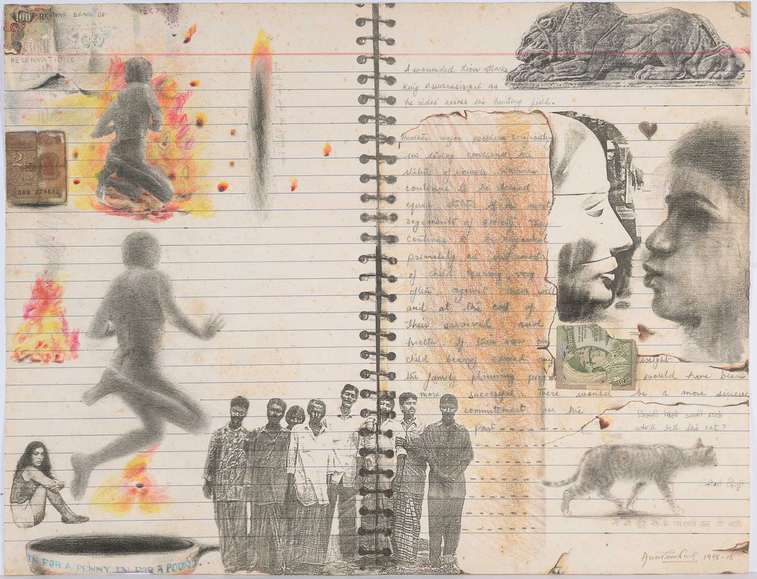 Using the ploy of multiple frames within a frame, or by partially cropping windows, doors or sharp-edged objects to dramatize the visual plot, the moving in and out of the grid or passing through the frame also marks spatial and temporal passage in Anupam’s works. Mysterious moments lined with deceptive humour and mischief accentuate the relation between metaphoric content and spatial devices. The onus of exegesis is thus placed on the viewer, who is expected to traverse the twilight zone of interpretation, quite like the couple in Between Vows and Words (1995)–entrapped by the enunciations of promise, and the terms of agreement unmoored floating without syntax or meaning.