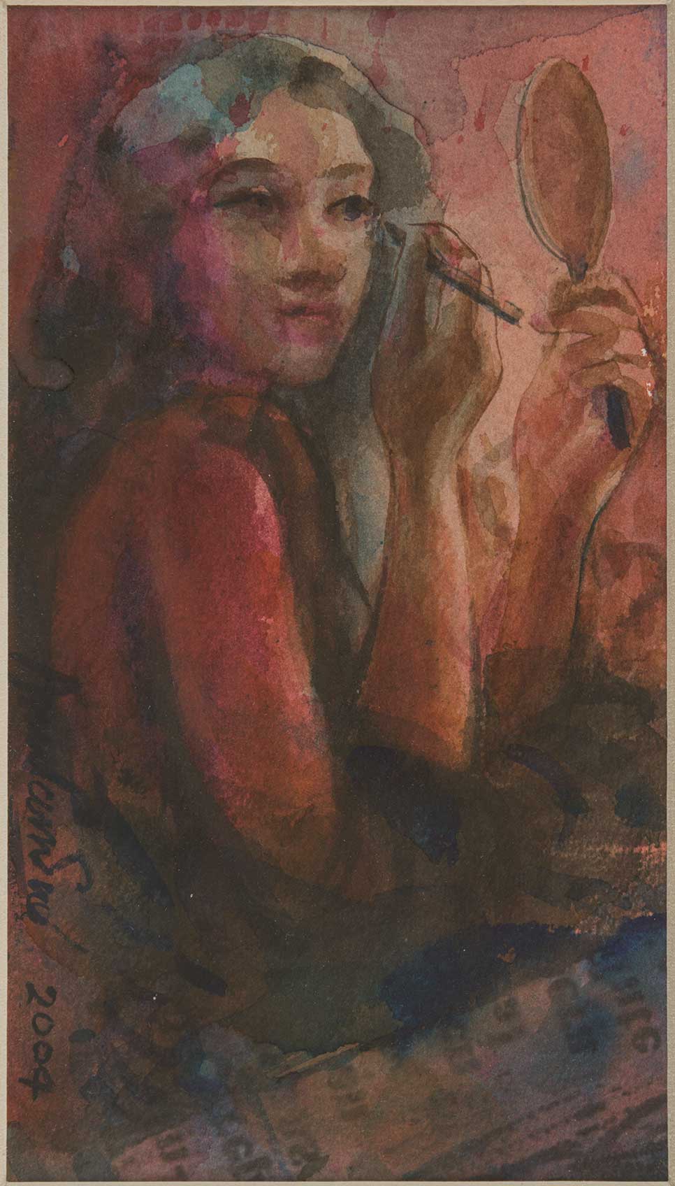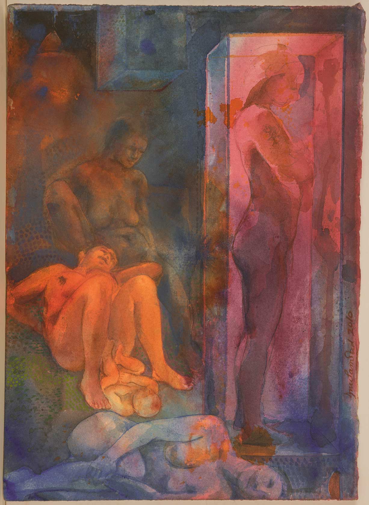 Her journey from ‘the plate to the palette’ has been a story both exemplary and singular. Her watercolours and mixed media works in their intimate scale reveal the joy of spontaneity and impulsive effusiveness. In her large-format oil paintings, she responds to the fluidity of space. Her eye and hand traverse the expanded visual field with brushwork that is tactile and palpable, by thinning oil for layering the surface with illusionistic pictorialism. Drawing continues to enchant her and remains the driving force behind her articulations.