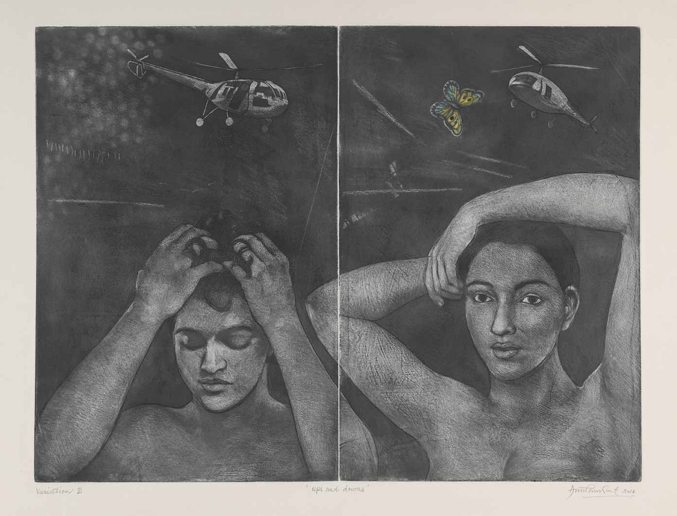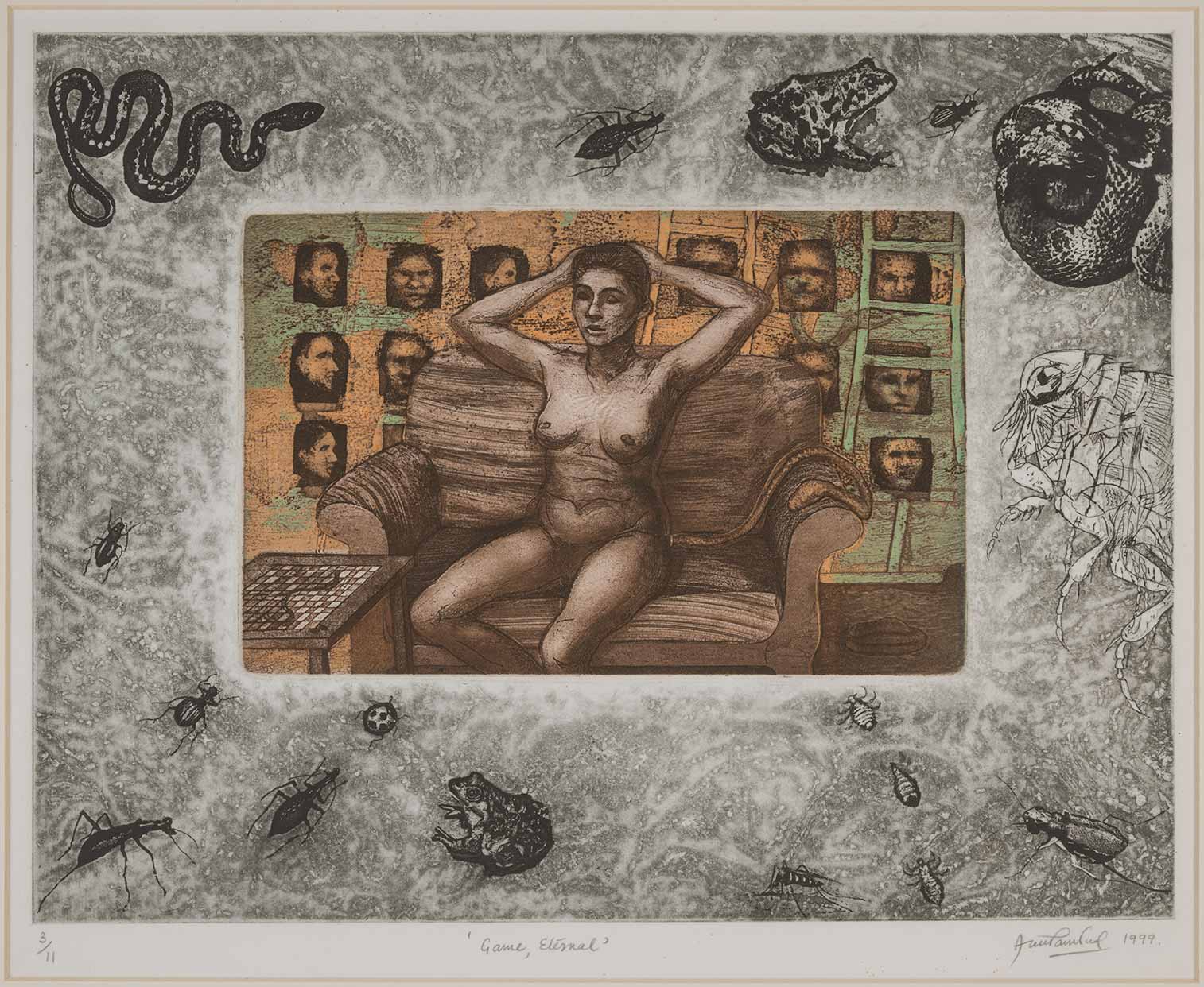 In her five decades of art practice, she participated in numerous group and solo shows across the globe including her first major solo exhibition - Graphics and Drawings: 1971-89 in Art Heritage, New Delhi; her first retrospective Transgression in Prints: Anupam Sud, Four Decades at Palette Art Gallery, New Delhi; and the major retrospective The Soul (Un)Gendered organised by Delhi Art Gallery, New York in collaboration with Kiran Nadar Museum of Art in 2019-20. Sud is the recipient of numerous awards and fellowships including the British Council Scholarship (1971), the President of India’s Gold Medal (1973), Sahitya Kala Parishad Award (1976, 1980, 1984, 1992, 1993), study and travelling fellowship in printmaking at the Centre for International Contemporary Art (CICA), New York granted by the Alkazi Foundation (1990), Charles Wallace Research Grant (1998) among others. Sud currently resides and practices in Delhi.