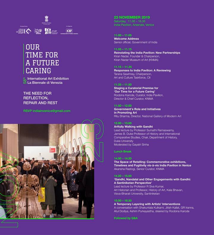 The program will include sessions, lectures and panels discussing the exhibition Our Time for a Future Caring presented at the India Pavilion which critically engages with the figure and philosophies of Mahatma Gandhi. It will begin with the session ‘Reinstating the India Pavilion: New Partnerships’ by Kiran Nadar, Founder & Chairperson, KNMA.