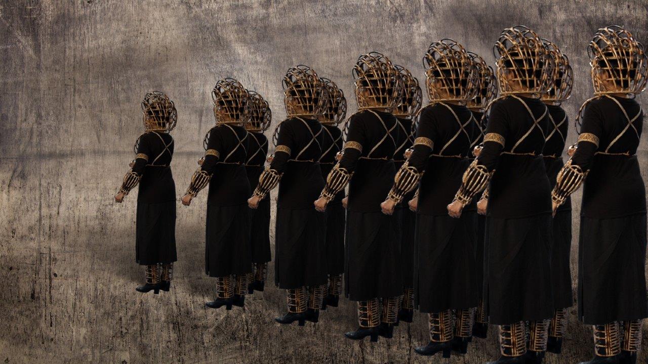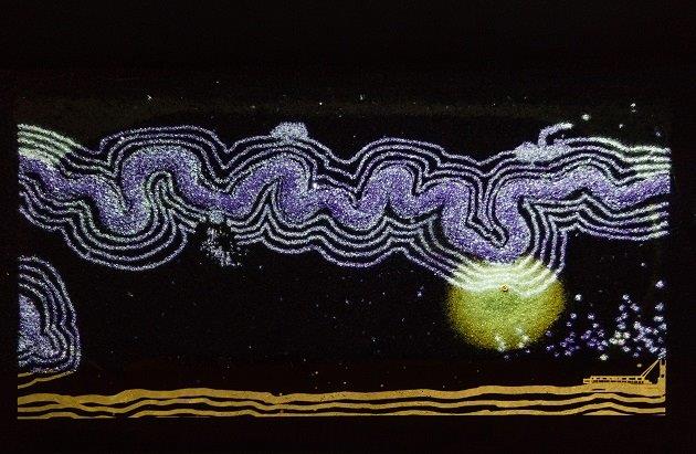 The exhibition offers journeys to unknown, real and imaginary terrains, that are speckled and marked with discreet and abstract presence, such as that of Shakuntala Kulkarni's army and procession of multiple selves/bodies in her immersive four-channel video work ‘Julus’ and Sheba Chhachhi’s mammoth elephant submerging or dissolving in water in her video ‘Water Diviner. Archana Hande’s video installation ‘The Golden Feral Trail’’ is transforming the West Australian horizon into a screen displaying stories of nomadism, economic relations and loss of cultural identity. From Vivan Sundaram’s bed of detritus that refers to the fabled city of Muziris, the viewer is taken to a strange forgotten abandoned outpost of Second World War off the U.K. coast, marked by huge metallic structures in Rohini Devasher’s video.