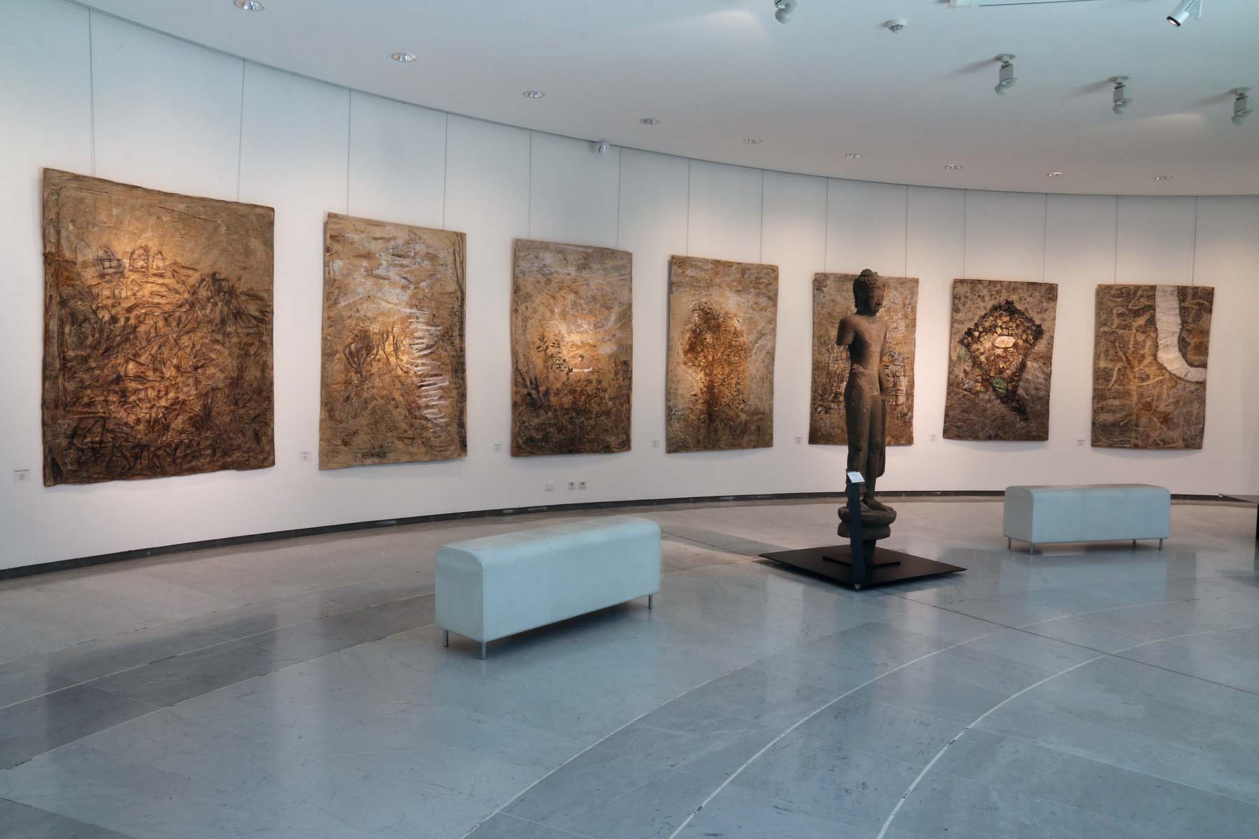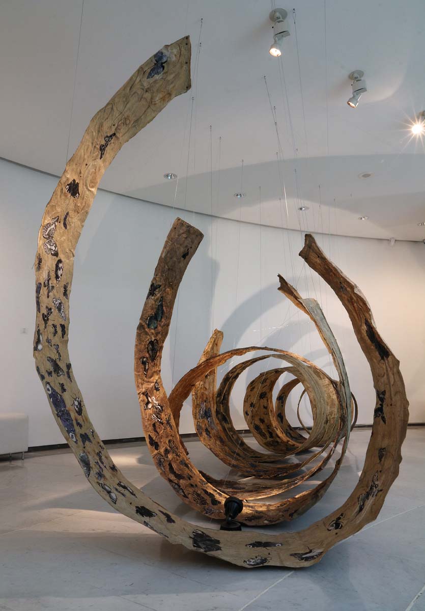The recent project at Musee Guimet is one of the most enterprising undertakings by Jayashree Chakravarty, responding to the specificity of the site, setting and scale, as well as to the circular plan of the rotunda. In the transformed ambience of the Carte Blanche space, one encounters a large, suspended paper structure, an imaginary form inspired by the tiny wasp-house/cocoon, but built in massive proportions, making it possible for viewers to enter into and experience her 'insect-world'. Bare from the outside, the canopy quite like caves and natural shelters, is inviting with its sensual earthiness and dark layered interior, which unfolds hidden mysteries on a closer look. The delicate ribbed armature of this form echoes the shape of shanties scattered over the city of Kolkata, and also brings to mind the slender ribbed-vaults of Gothic architecture. Hanging above the ground, it appears like a slow crawling form, with the partly visible feet of visitors conceived as an inherent part of the insect-form. The seventeen large soaring paper scrolls displayed around as a continuous curtain, transform the space of the rotunda, creating an immersive environment for a deeper engagement.