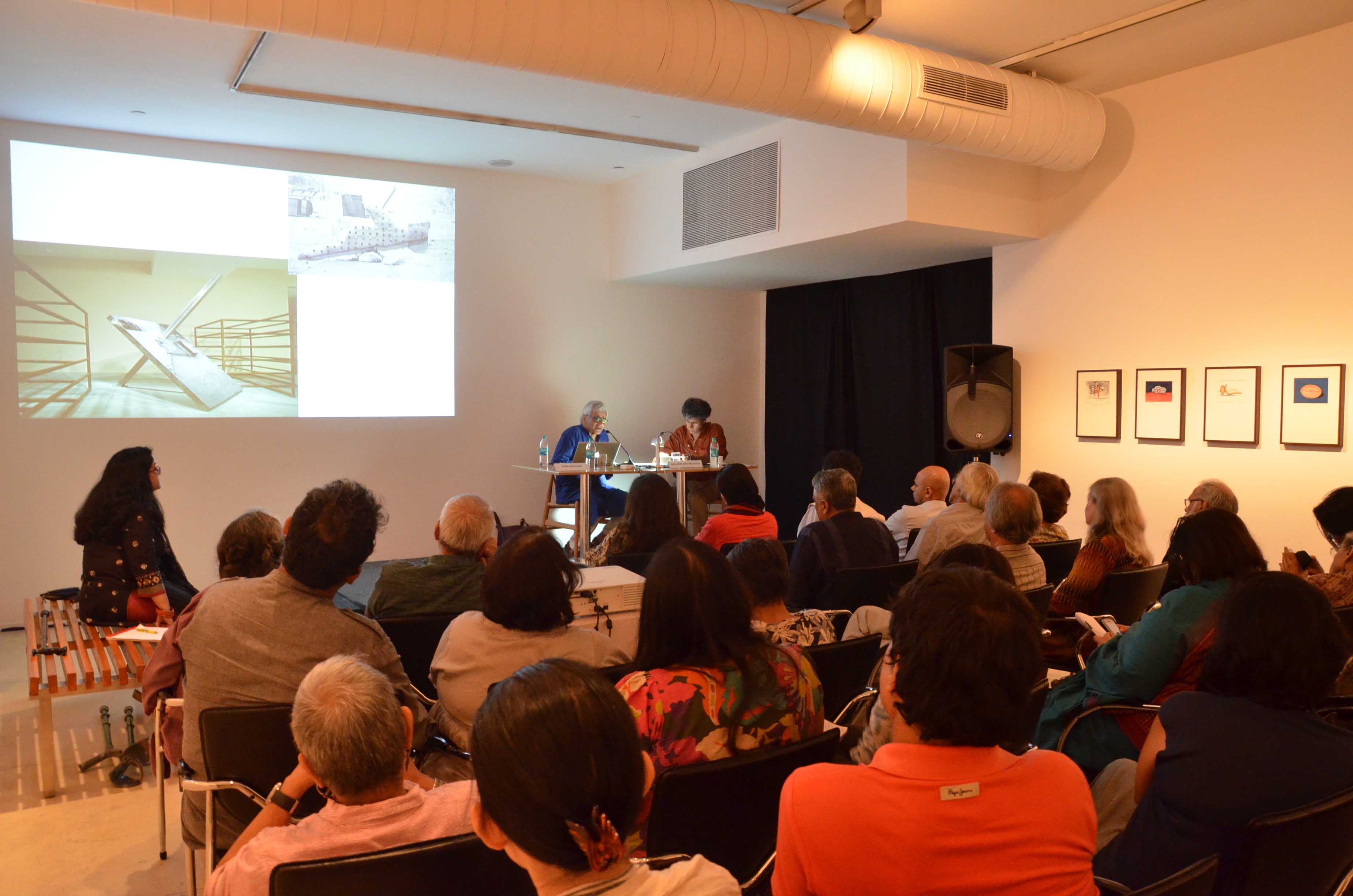 In this conversation around the exhibition 'Is it What You Think? (Ruminations on Time, Memory & Site)', a show about history as form, Vivan elaborated on his five sets of work (two sets of charcoal drawings, which are referenced after the Auschwitz and the gulf war respectively and heavily influenced by cinema, and three installations) which he related to different aspects of history. One of them is The Memorial, constructed in 1993, post the Babri Masjid demolition and the Bombay riots. Vivan explicated the newly added elements to it, invoked the influences that went into its making and the impact of minimalism and suprematism on it in the company of Prof. Neeladri Bhattacharya, who has had a particular interest in understanding the politics of memory, something which is central to Vivan’s aforementioned work. He also shed some light upon the intersection of photographs, sculpture and abstraction in this installation. Prof. Bhattacharya elaborated on how history refers back to the archive, and historians, just like artists, refer back to the trace, and interpret and understand it through a narrative as well as the temporality of the works.