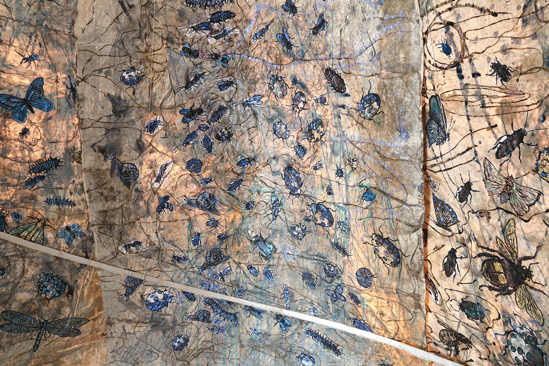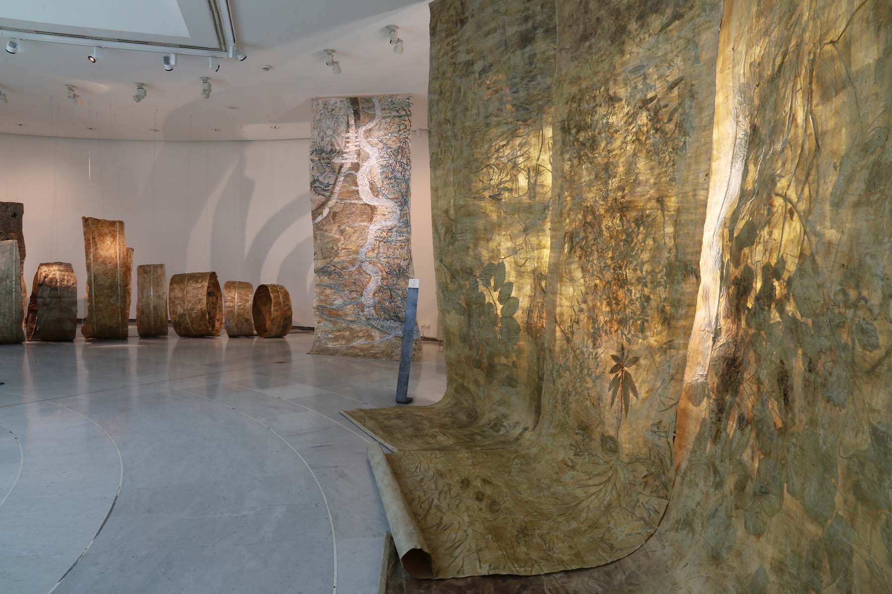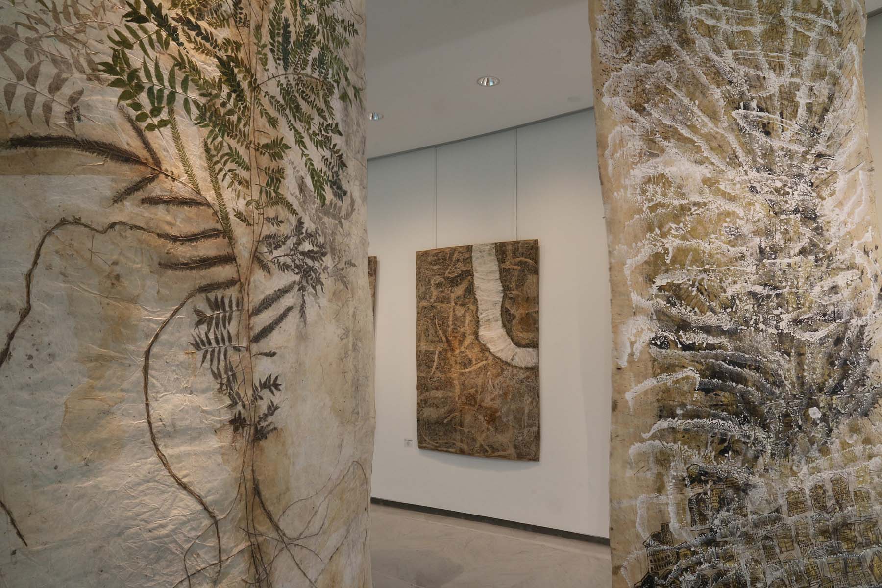 Jayashree Chakravarty’s preoccupations and concerns in her art practice largely address the shrinking natural habitat and water bodies in ever-expanding Indian cities. She lives by herself in a rapidly urbanizing suburb of Kolkata in eastern India, where she watched the rich marshlands of Salt Lake, transform into “Salt Lake City”, now a congested residential neighbourhood. Observing the uprooting of wild flowers and grass, some of them part of the local lore and known for their medicinal value, the consequent vanishing of the once abundant animal, vegetal, and insect life around her have sharpened her sensibilities and perceptions to the irreparable in nature. Alluding to the cluttered environment of the city, her densely painted monumental canvases explode with excessive imagery, both gestural and visceral, to draw viewers into the vortex of unsettling inchoate landscapes that evoke spatial and temporal turbulence. Her recent soaring installations with long suspended scrolls have nature as both subject and material. Instantly, we seem to encounter a maze created out of an overlay of painted and woven imagery, interlaced and secured between the skeins/skins of pasted paper and fabric. A closer look reveals petals, dry leaves, seeds, stems, roots and plant-remnants embedded into her multi-layered creations that cannot be experienced from any single vantage point. In contemporary times, where industrial materials and technology have opened up possibilities of more varied artistic and conceptual conquests, Jayashree’s hand-made organic forms gestures the need to be closer to nature, seeking through her work, ways of recuperating the self and the world we live in. Through a poetic evocation in her recent exhibition titled ‘Life will never be the same’, Jayashree encapsulates many overlapping emotions and personal experiences. She acknowledges the inevitability of constant change, fundamental to life, and yet she accentuates the lamenting tone pushing forward the potency of the phrase, as if pained by an irreconcilable loss, while at once perhaps, she expresses a longing to be located in a time and space of a utopian past. Unpretentious and fiercely honest, Jayashree Charkravarty, has raised with utmost humility, the most pertinent question that we must all confront and reflect on– ‘how to live and let live’. Roobina Karode Curator