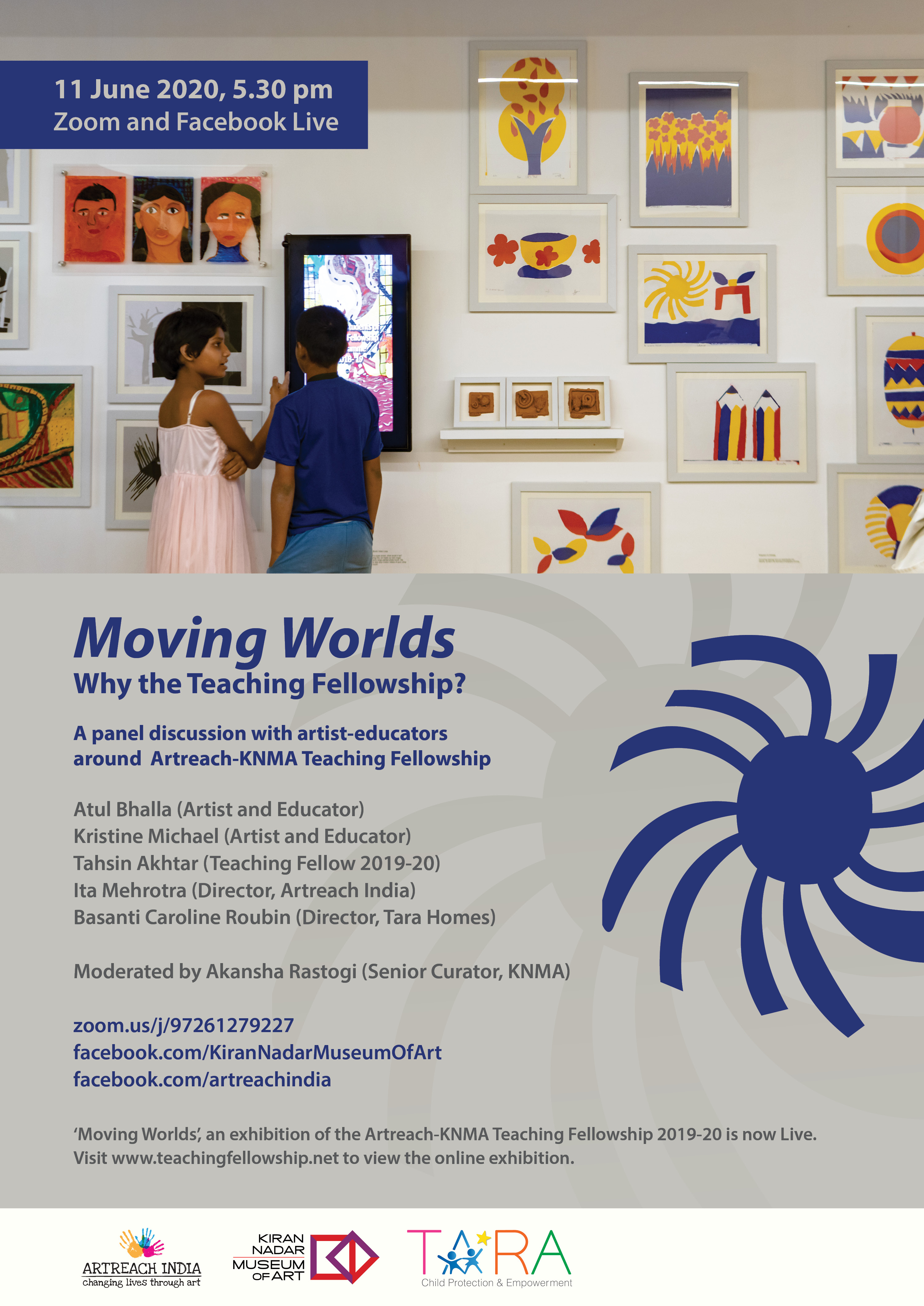 This panel discussion is a collateral event of ‘Moving Worlds’, Artreach-KNMA’s fifth Teaching Fellowship exhibition with TARA Homes. The exhibition and the fellowship was conceptualised and led by artist Tahsin Akhtar. Eighteen participants between the ages 11 to 17 were selected by TARA Homes based on interest and aptitude. Over the course of the programme, from July 2019 to May 2020, Tahsin held weekend workshops on observation drawing, collage, still life, making flip-books, character design, clay modelling, animation and nature studies. During the lockdown, workshops over ZOOM inspired students to create introspective portraits, and paintings inspired by the world’s greatest artists. The group had a curated walk through and workshop at the India Art Fair in February 2020 where they witnessed a wide variety of multi-media art from around the world.
