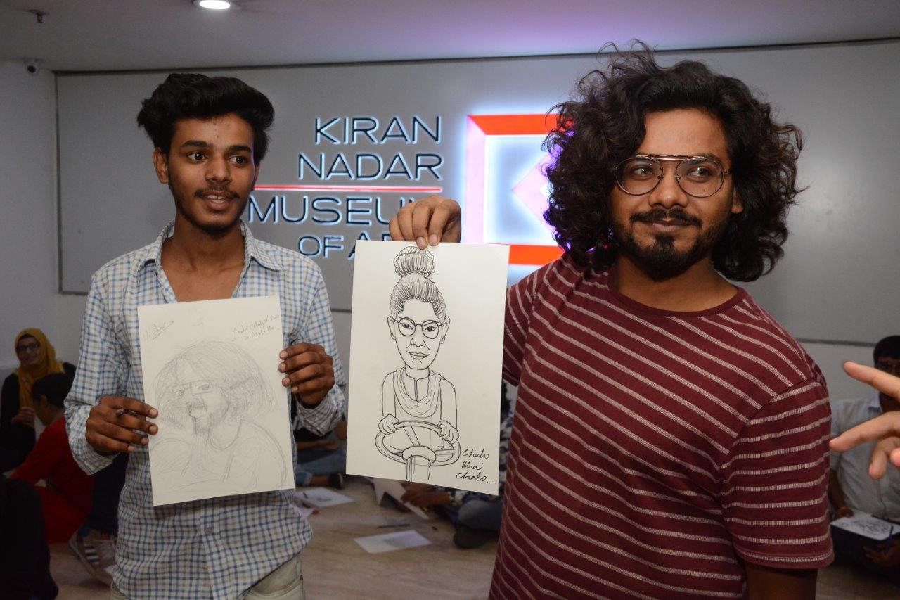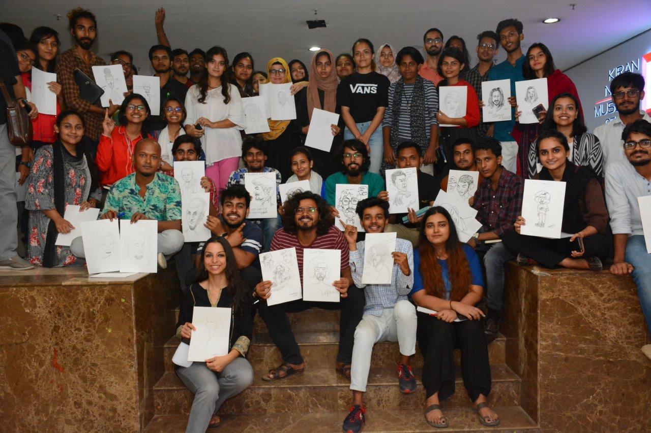 As a part of outreach activities in the month of September, the curatorial team of the museum organised walkthroughs, workshops and discussions across a varied demography including delegates and students of B.A. Urban Sociology from Lady Shri Ram College of Woman and Kamla Nehru College. In collaboration with FICA and Serendipity, KNMA hosted students for a discussion on Smell Assembly. A walkthroughs and impromptu caricature sketching exercises related to the ongoing exhibition Common Course were arranged for students of Jamia Milia Islami. This event was organised in collaboration with Centre for Art and Free Expression (CAFÉ), Jamia.
