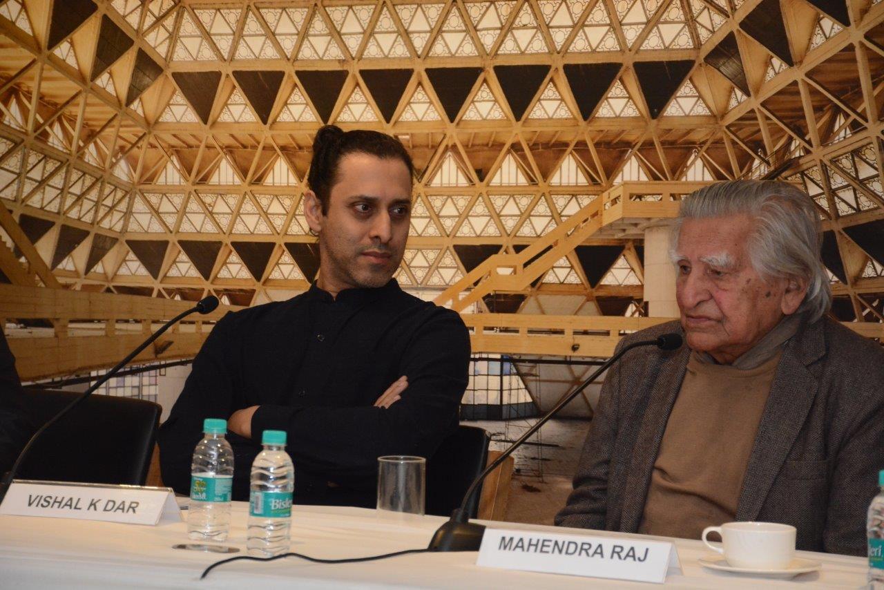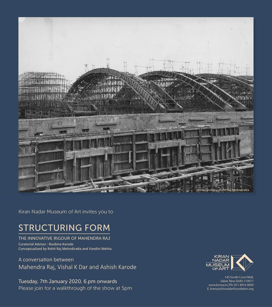 On 7 January 2020, KNMA Saket hosted a panel discussion with Ashish Karode, Vishal K Dar and Mahendra Raj discussing his work in the architectural arena, especially in the field of structural engineering. The event was attended by senior architects as well as younger students of the discipline. The conversation was part of the show 'Structuring Form - the innovative rigour of Mahendra Raj