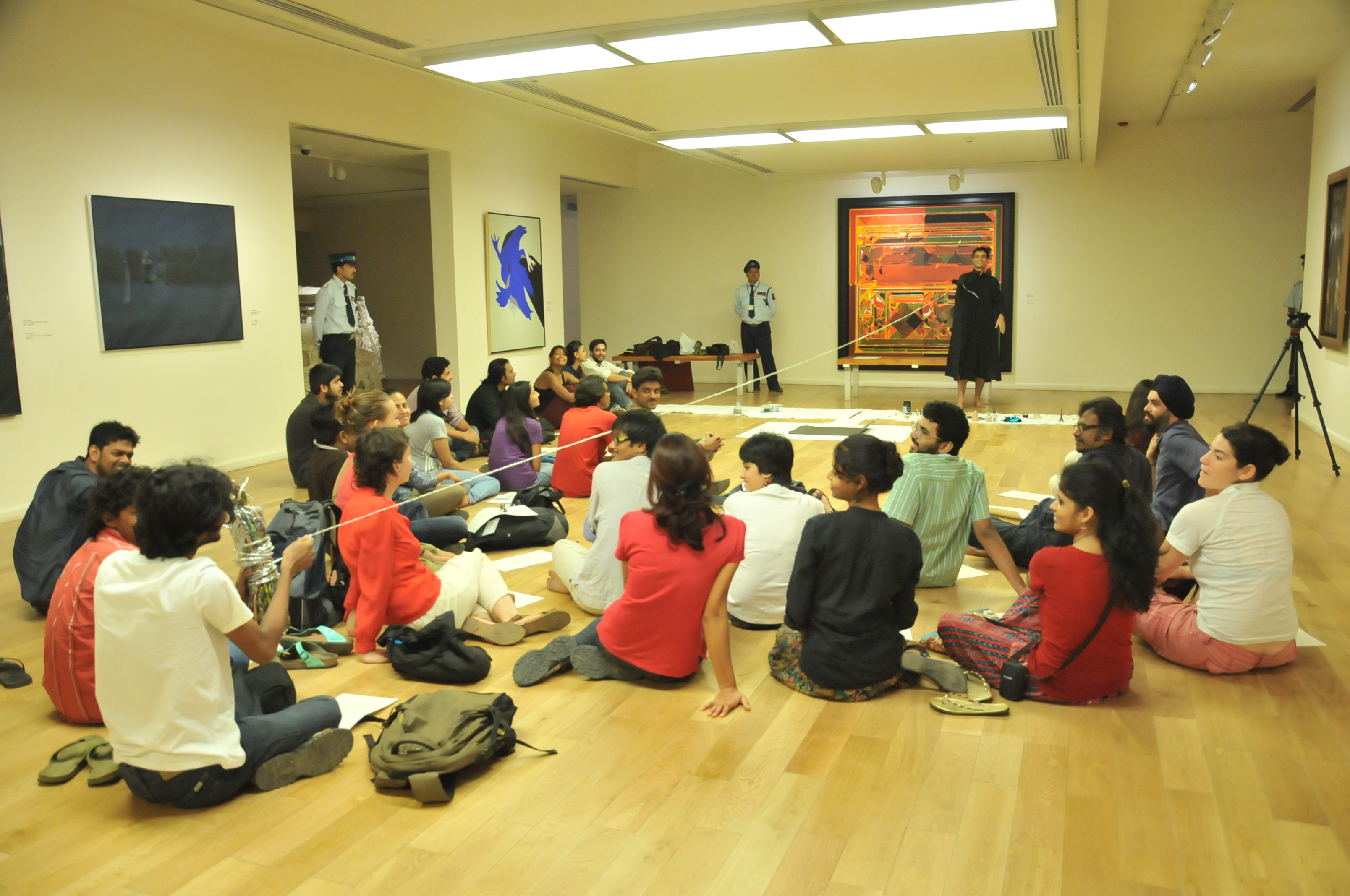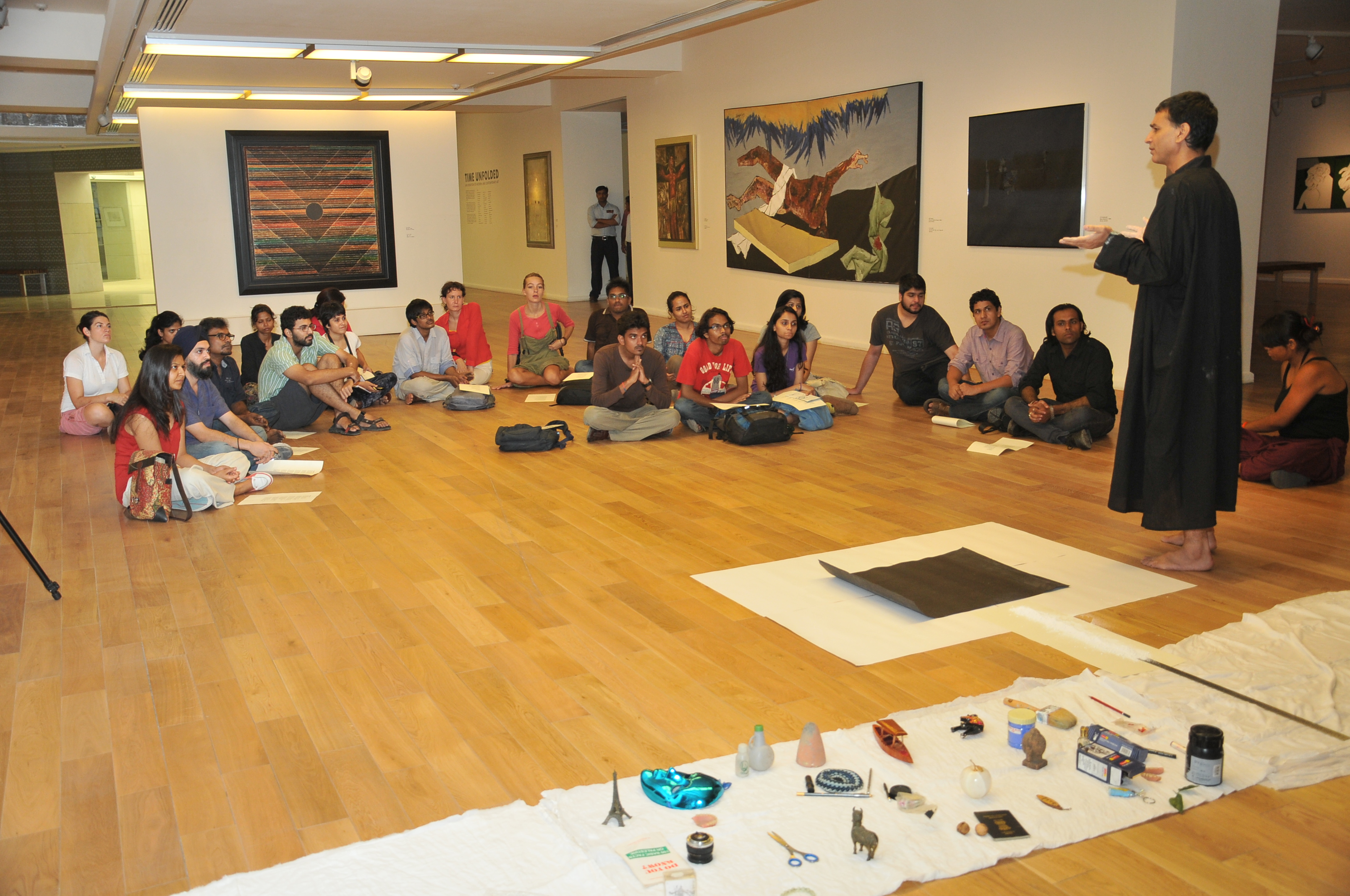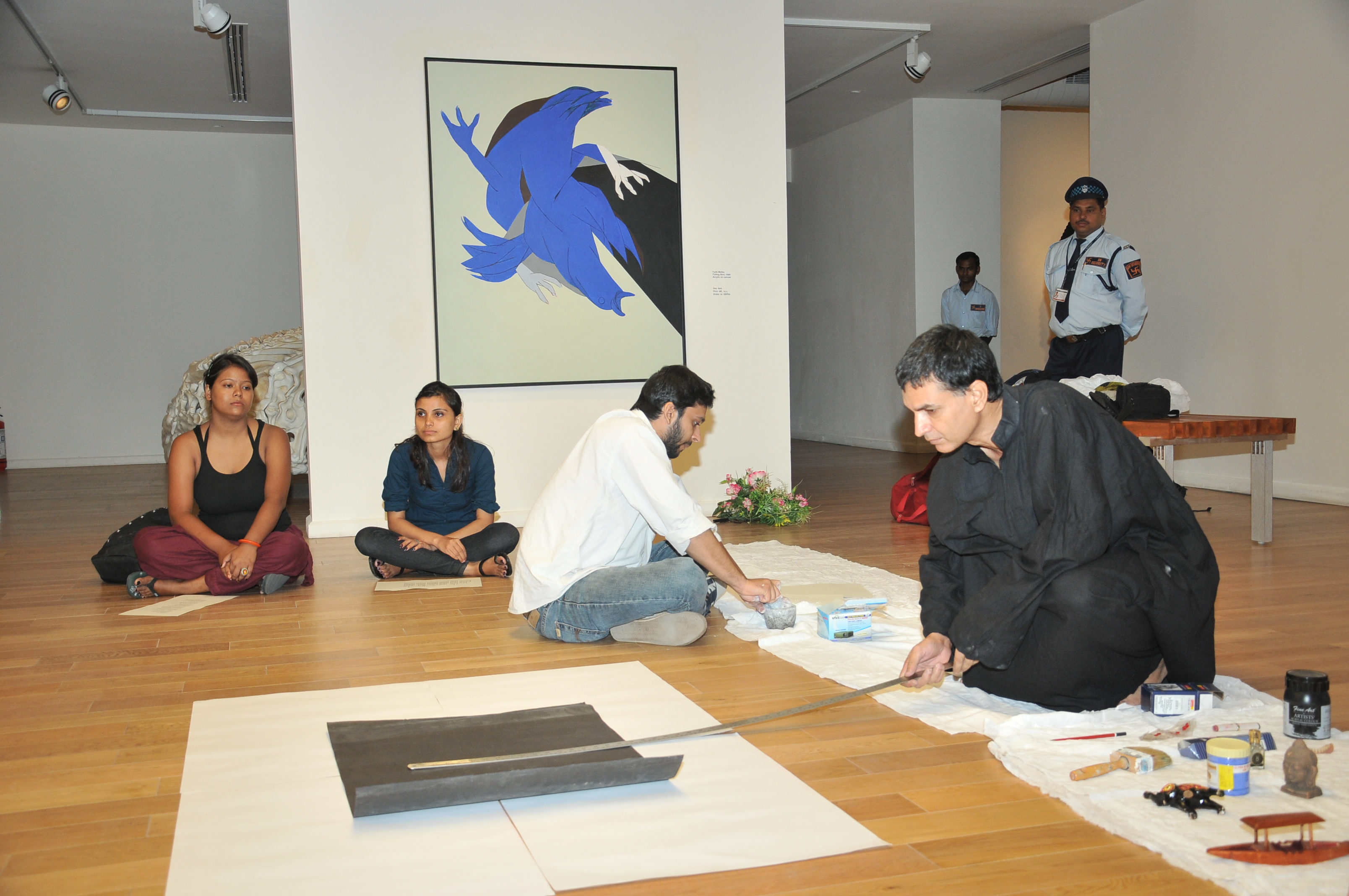 Artist Inder Salim was invited to conduct the first performance art workshop at KNMA, Saket. The workshop was an experiment with live art, presented in the context of artworks displayed in the museum. Participants included students from Delhi College of Art, Delhi University, Kurukshetra University, advertising professionals and emerging artists.