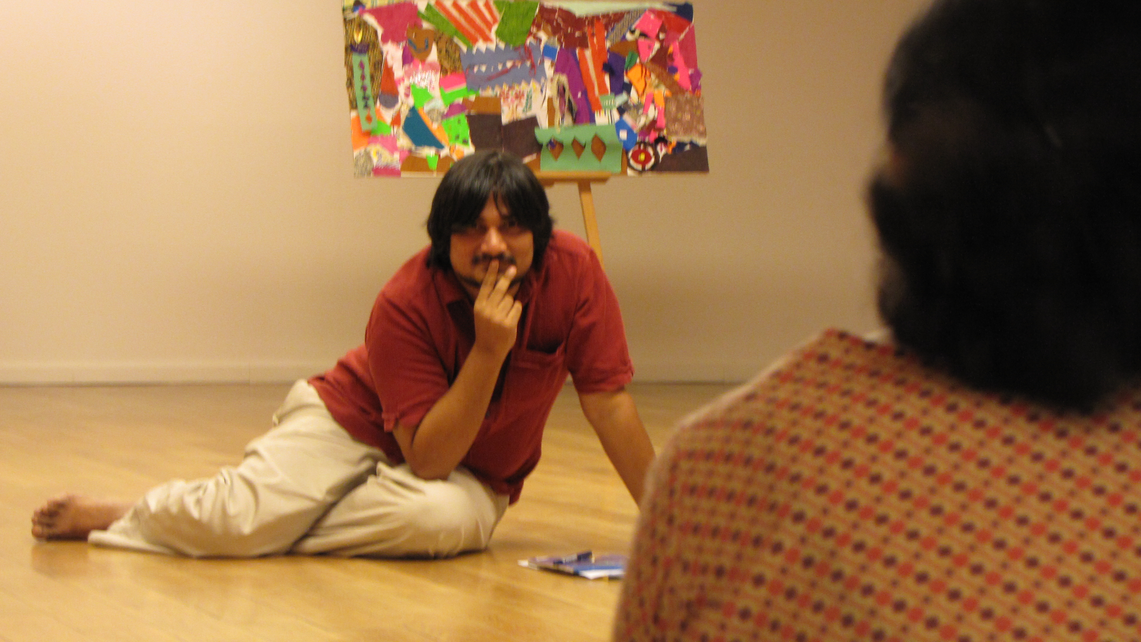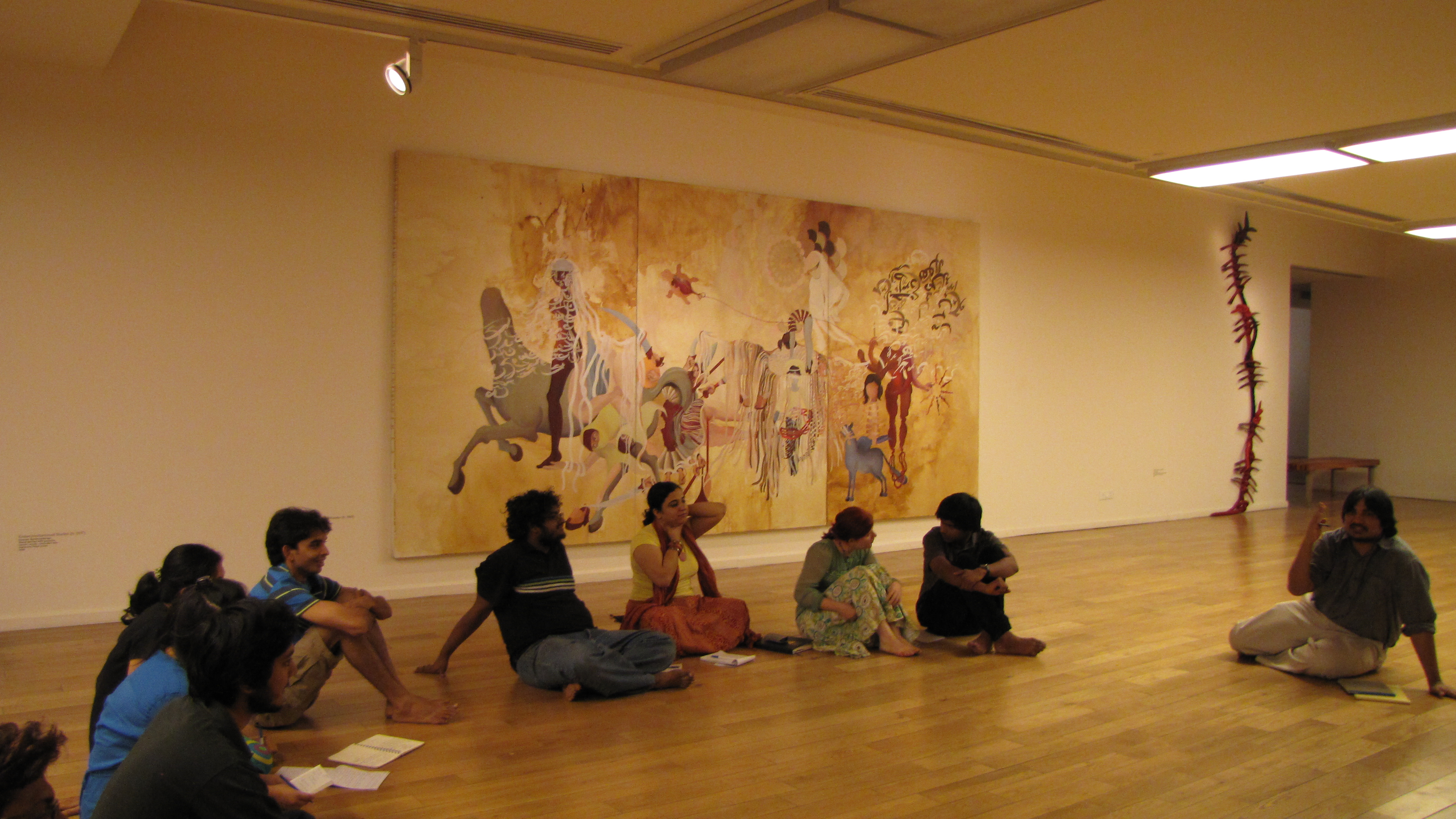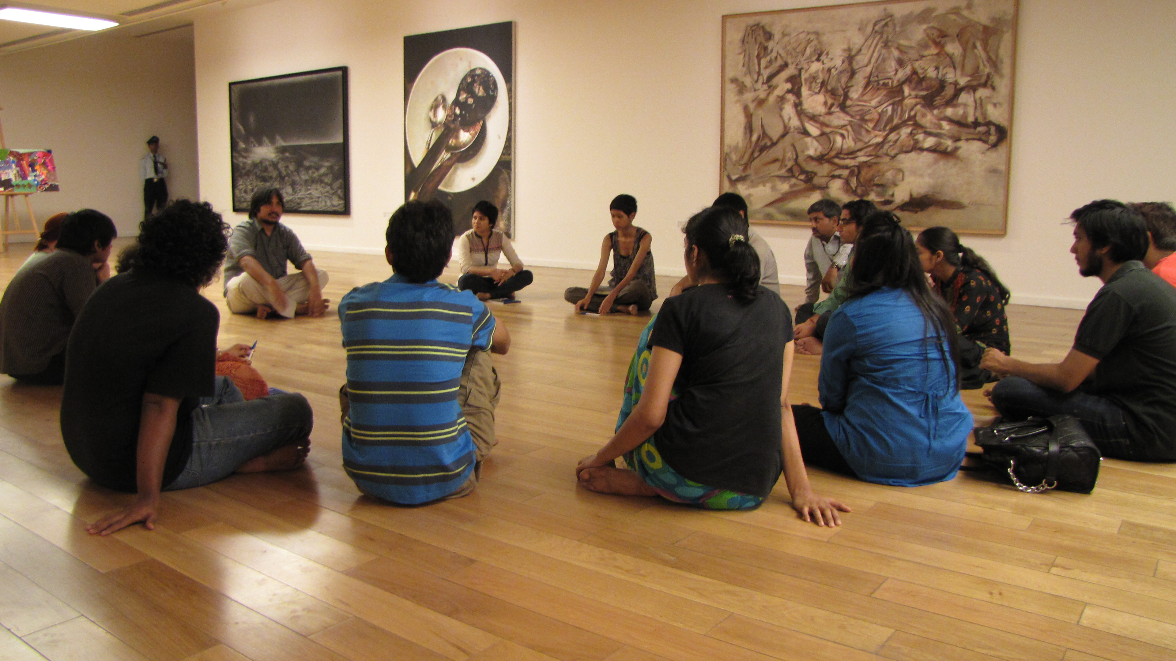 This intensive playwriting workshop focused on writing dramatic performance texts based on selected artworks displayed inside the museum. Conducted by acclaimed theatre practitioner Neel Chaudhuri, the workshop began with writing exercises: experimenting with writing for a space, in a space and with space on the first day. On Day Two, participants after a selection of artworks developed initial concept ideas for writing creative fictions around artworks. It concluded with refinement, more discussion and sharing of performance scripts during the last session. The workshop allowed more narratives than the art-historical readings of artworks to emerge and open up imaginative extensions.