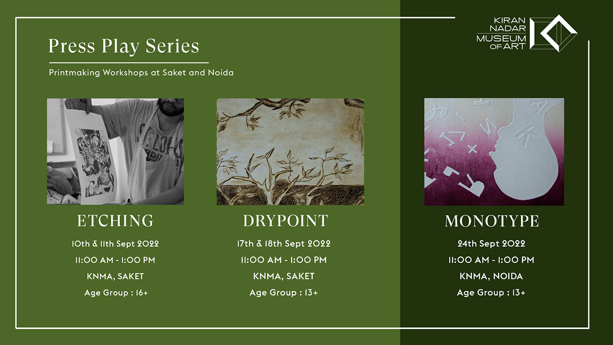 This workshop will run within the context of the ongoing exhibition of works by Anupam Sud titled Between Vows and Words open until end of October 2022. As a series of workshops that runs parallel to the exhibition, PRESS PLAY will involve slightly more technically intricate methods of printmaking that require an etching press. The series will impart knowledge of and make participants appreciate the umbrella field of Intaglio prints, which covers techniques like Etching, Drypoint, Collagraph, Monotype etc.