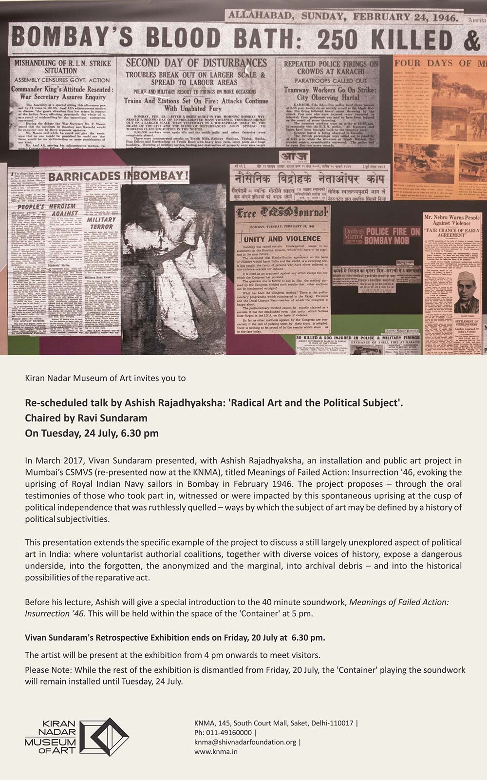 In March 2017, Vivan Sundaram presented, with Ashish Raiadhyaksha, an installation and public art project in Mumbai’s CSMVS (re-presented now at the KNMA), titled Meanings of Failed Action: Insurrection '46, evoking the uprising of Royal Indian Navy sailors in Bombay in February 1946. The project proposes - through the oral testimonies of those who took part in, witnessed or were impacted by this spontaneous uprising at the cusp of political independence that was ruthlessly quelled - ways by which the subject of art may be defined by a history of political subjectivities.