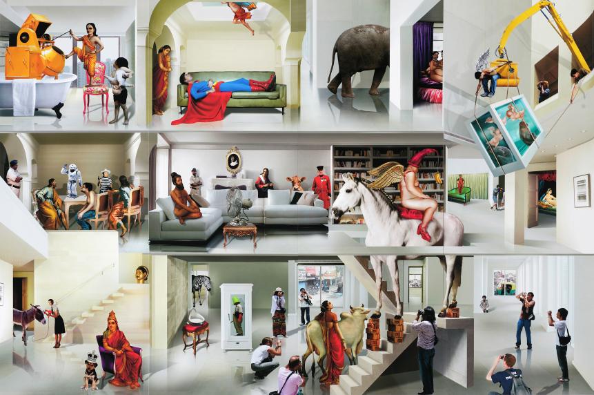 The exhibition opens with a sharp juxtaposition of contemporary Indian artist Bharti Kher’s life-size fiberglass sculpture of an elephant Skin Speaks a language Not its Own and the modern master V. S. Gaitonde’s abstract painting. The first section titled ‘Engaging the Local’ focuses on the regional category ‘Bengal’ as the center of cultural fermentation and Modernism in pre-independence Indian art. Based on the evolving modernist language for the new nation, the second section ‘Defining the Modern’– Bombay Progressives includes works of the extended Progressive Artists’ Group highlighting the growing drive towards abstraction. The third thematic titled ‘The Body: Corporeal to Ethereal’ deals with the body as the bearer of personal, social and political inscriptions. The next section ‘Perspectives on the Diaspora’ presents works of two Indian diaspora artists, Raqib Shaw and Anish Kapoor, voicing their global artistic visions. The last thematic ‘Visual Culture and Art’ draws upon the popular imagery that the artist excavates from various sources using popular imagination, traditional myths and Western and Indian art history.